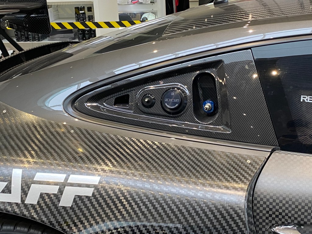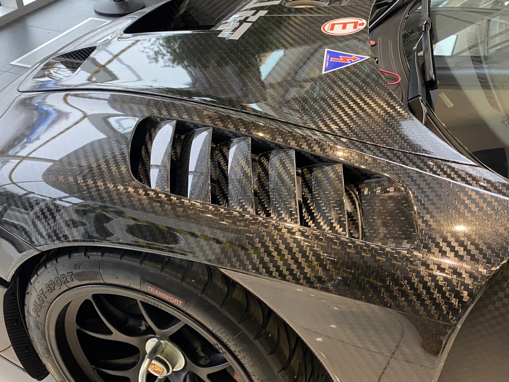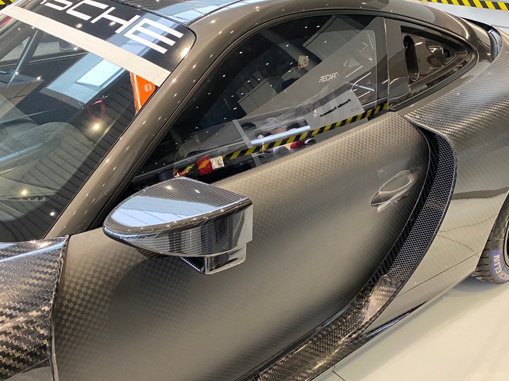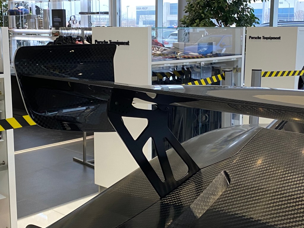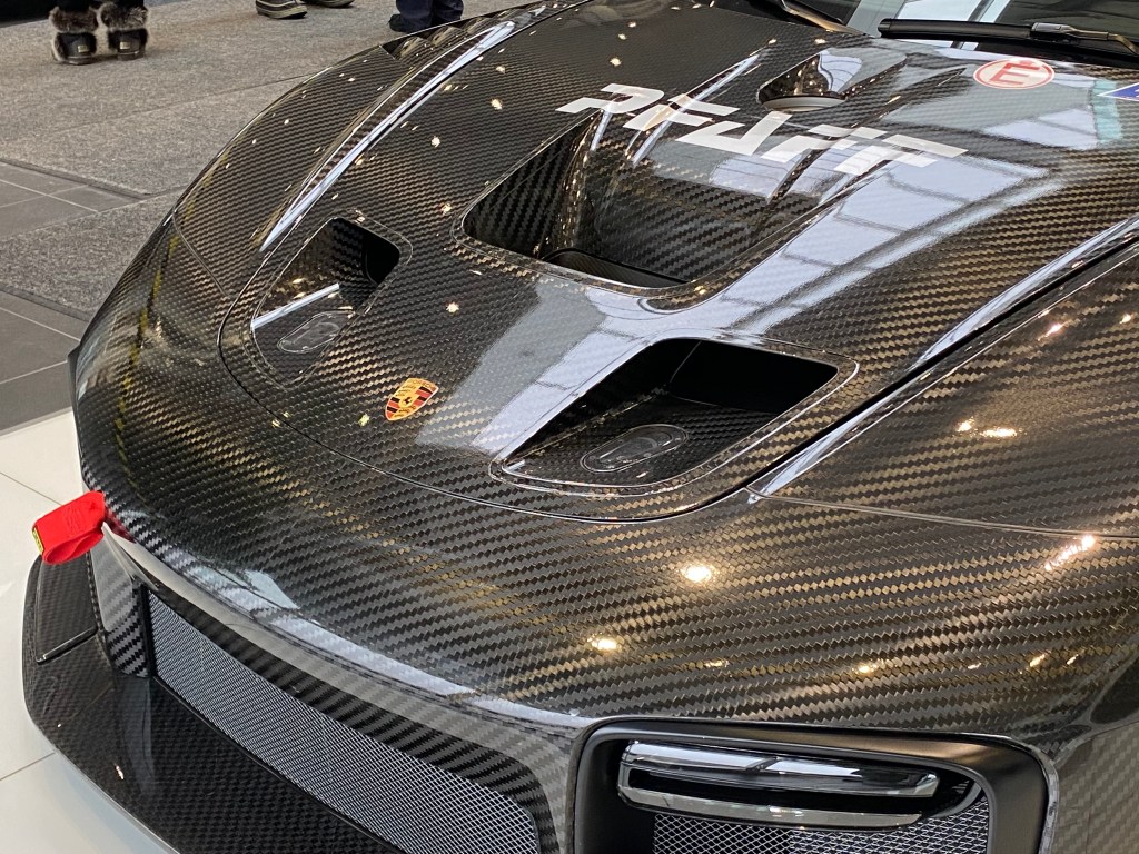 Upon seeing the car, the first thing I took in was just the enormous amount of carbon fibre used throughout the exterior. From the principal body panels, all the way to the mirrors and wings this car has. It’s not until you start to get a better look at the car that you begin to notice the even smaller details. For instance, its center-placed, dual exhaust made from titanium, or air jacks and fuel caps located just behind the doors. Another unusual detail would be the PDK gear selector that is made from wood. Looking at the size of the car, I was surprised to see how much longer it was in comparison to a regular 911, likely due to the additional aero components. Smaller-sized wheels are also used in favour of having thicker tires(Michelins in this case), likely for increased grip.